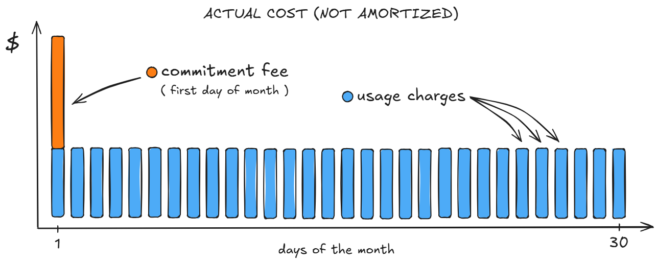 If the provider did not amortize the commitment cost, it would show up as a large spike on the first day of each month, distorting the realistic picture. Cost report users could misinterpret this as an indication that more resources were used on that single day, and fewer on the remaining days of the month, even if resource utilization was actually constant. If they looked at the unit cost, it would also show a distorted picture, much higher than reality for the first day and somewhat lower for the other days.
