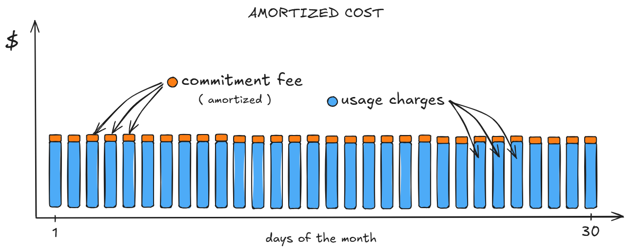 To fix this issue, the provider will amortize the fee, spreading it proportionally across sub-periods (days, hours, seconds) of the commitment term. I mention multiple time granularities for two reasons. One is that you can choose to report at different granularities, and the other is that different billing line items might use different granularities. For example, compute usage is usually billed on a per-second basis, but discounts are often applied on a per-hour basis.